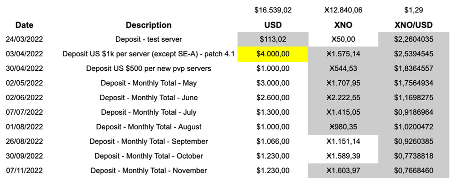 Os depósitos são comunicados publicamente nas redes sociais e na comunidade do Kakele Online e, até o momento de redação, cerca de Ӿ12,840.06 já foram depositados pela equipe na pool de GOLD/XNO. Essa quantia equivale a cerca de US $16,539.02, considerando a cotação média nos dias dos depósitos.